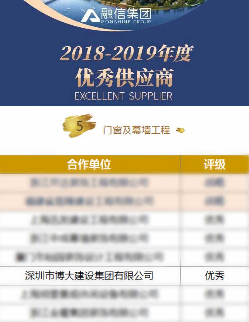 博大建設(shè)集團(tuán)在2018-2019年度成績(jī)突出,榮獲融信集團(tuán)頒發(fā)的門(mén)窗及幕墻工程“優(yōu)秀供應(yīng)商”稱號(hào)。融信集團(tuán)創(chuàng)立于2003年,總部位于上海,是中國(guó)房企20強(qiáng)。